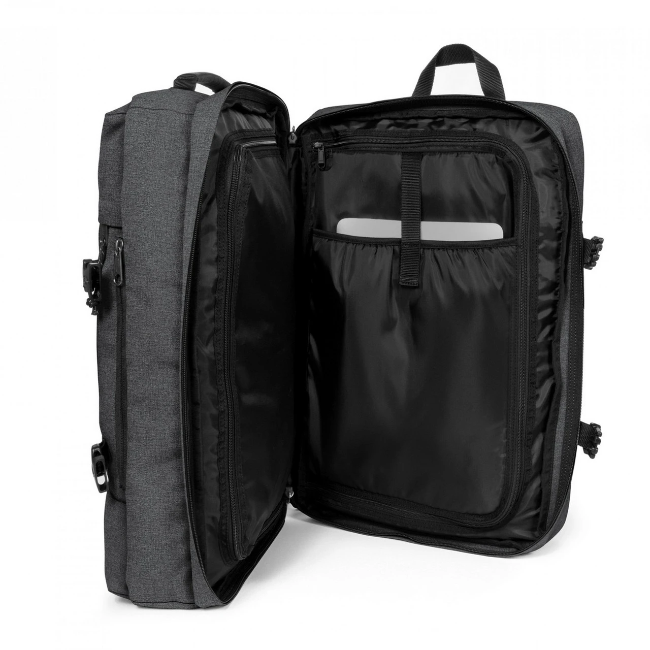 A compact design has been teamed with an extremely lightweight but hard-wearing outer build with topped raincoat material to give us this Cabin Bag from the Eastpak Tranzpack collection. Offering multiple carrying options including fold-away backpack straps and side handles, this bag is ideal for weekend breaks and short stays and offers a generous internal capacity of 42L, giving it a great weight to size ratio. The Tranzpack has double compartments and an easy book opening design, and even has a protective sleeve for a laptop of up to 17”.